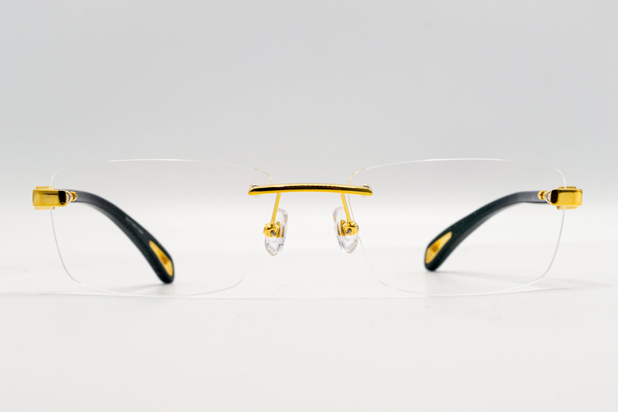 Dit model is een randloos montuur van titanium en buffelhoorn.